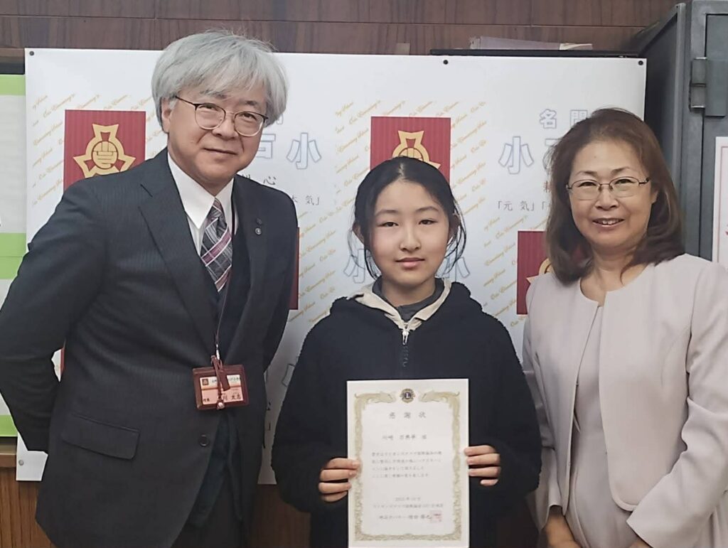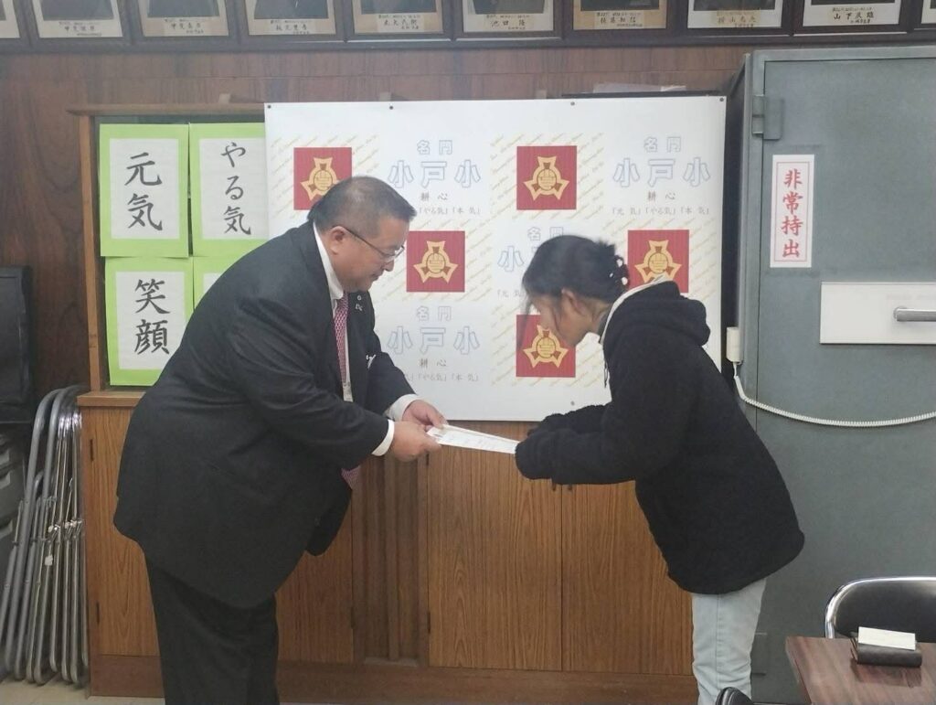 10月にヘアドネーションをされた川﨑万典華様へ小戸小学校校長室にて感謝状と記念品の贈呈式を行いました。