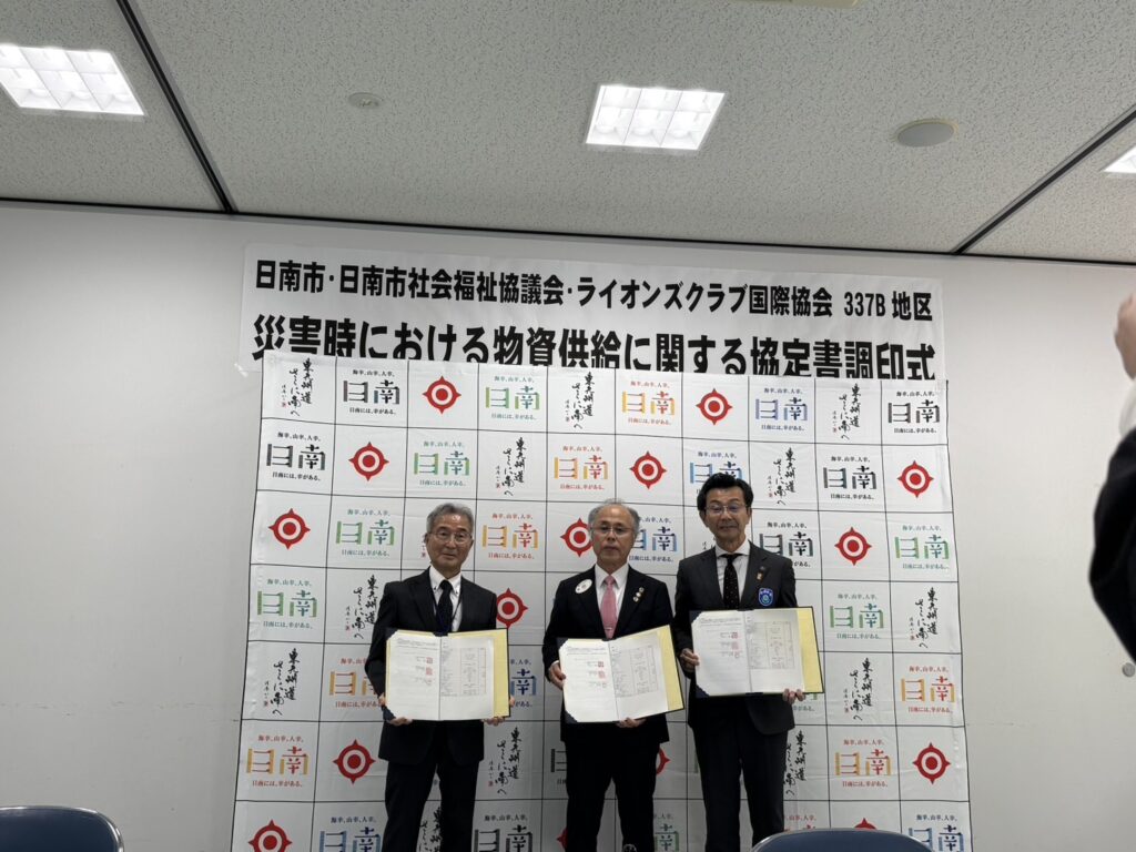 日南町・日南市社会福祉協議会・ライオンズクラブ国際協会337-B地区の「災害時における物資供給に関する協定書調印式」が日南市で執り行われました。
